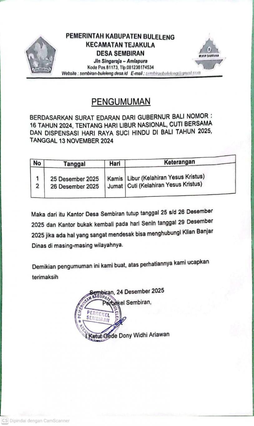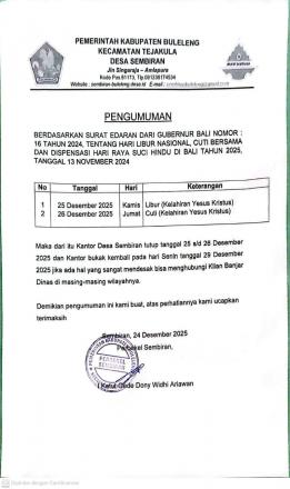 Sehubungan dengan hal tersebut, kegiatan perkantoran dan pelayanan di Pemerintah Desa Sembiran diliburkan pada tanggal 25 dan 26 Desember 2025.