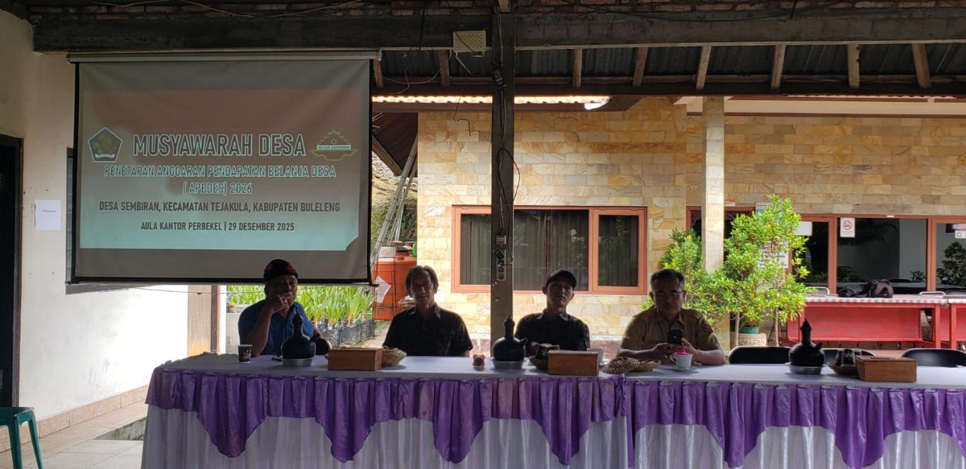 Pemerintah Desa Sembiran melalui Badan Permusyawaratan Desa (BPD) Sembiran menyelenggarakan Musyawarah Desa (Musdes) Penetapan Anggaran Pendapatan dan Belanja Desa (APBDes) Tahun Anggaran 2026. Kegiatan ini dilaksanakan di Aula Kantor Desa Sembiran pada hari Senin, 29 Desember 2025.