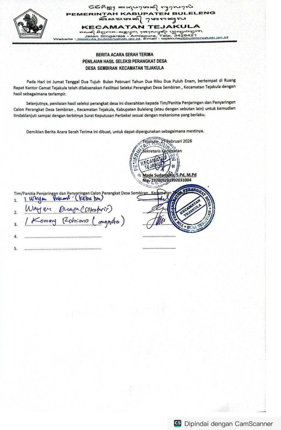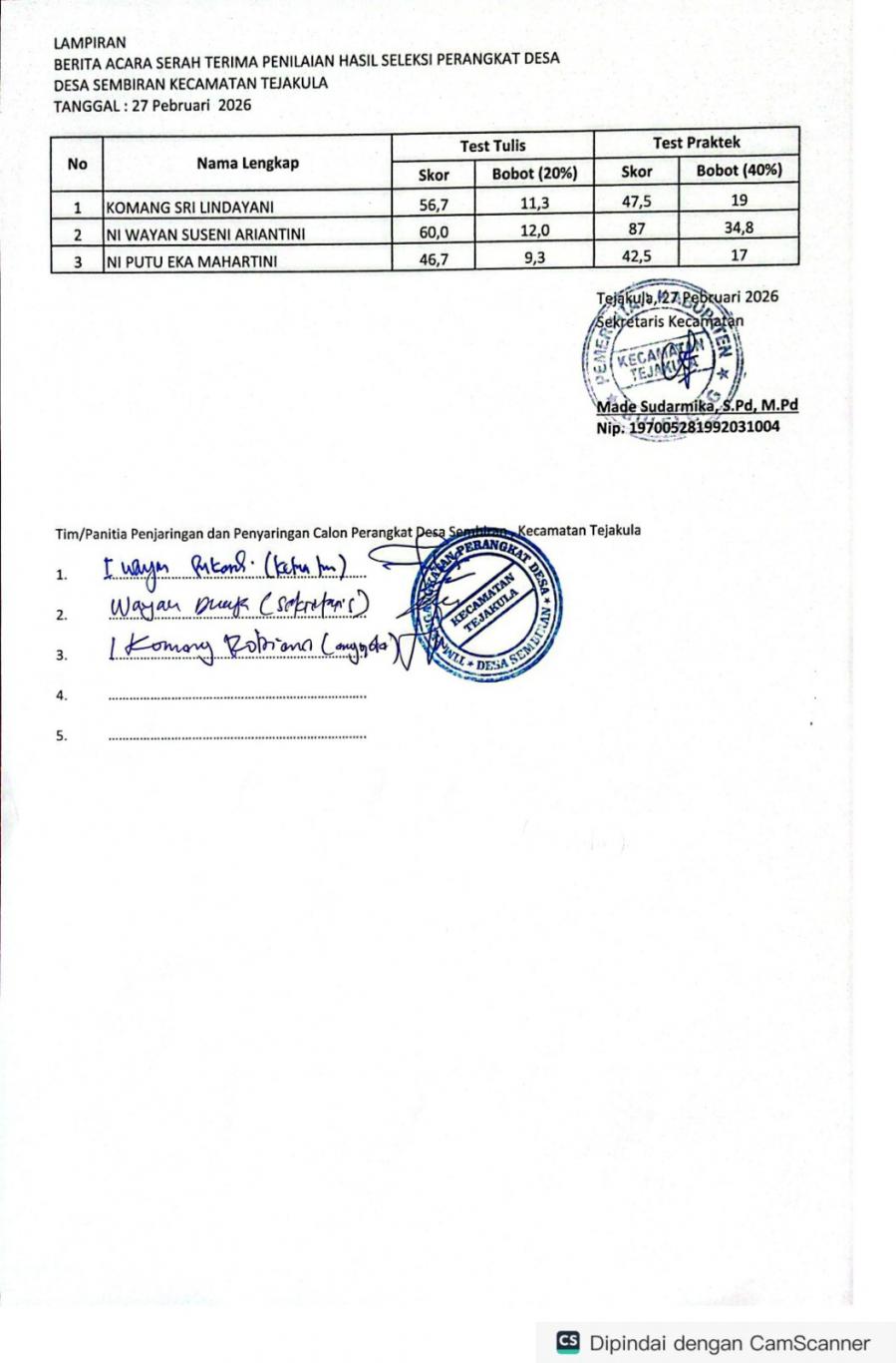 Tahapan tes dilaksanakan meliputi Tes Tulis (20%), Tes Praktek (40%) dan Tes Wawancara (40%), Hasil seleksi berdasarkan Berita Acara Tim Pengangkatan Perangkat Desa Sembiran adalah Seperti dalam Berita Acara Terlampir :